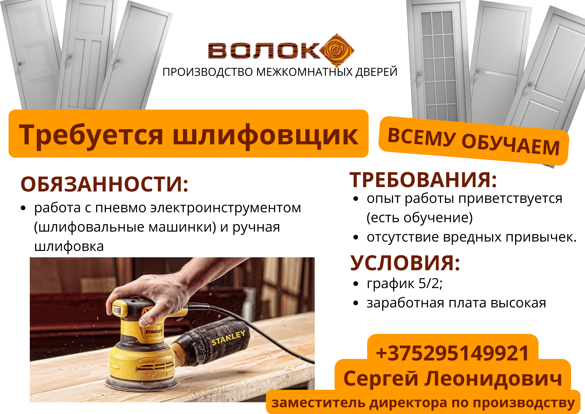 Вакансия шлифовщика на предприятие в г.п. Коханова